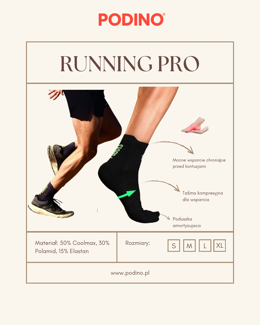 Podoks Running High to pierwsza opatentowana biomechaniczna skarpeta, zaprojektowana przez podiatrów w celu optymalizacji kroku, zmniejszenia zmęczenia mięśni i zapobiegania kontuzjom. Jej wysoka cholewka do łydki zapewnia dodatkową ochronę i wsparcie, co czyni ją idealną dla biegaczy i sportowców poszukujących większej stabilności i komfortu.